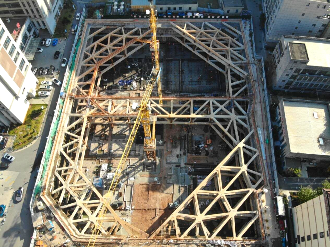 創(chuàng)新采用“旋挖樁+三層混凝土內(nèi)支撐”的復(fù)合支護體系。基坑平面尺寸達105.2米×81.9米,深度13.3—15.05米,設(shè)置支護樁279根、鋼立柱54根及三層混凝土內(nèi)支撐。針對雜填土區(qū)域富含地下水的情況,項目在支護樁間增設(shè)214根高壓旋噴樁,構(gòu)筑起一道可靠的截水帷幕,有效防止了基坑邊水土流失,保障了基坑穩(wěn)定與周邊建筑物安全。